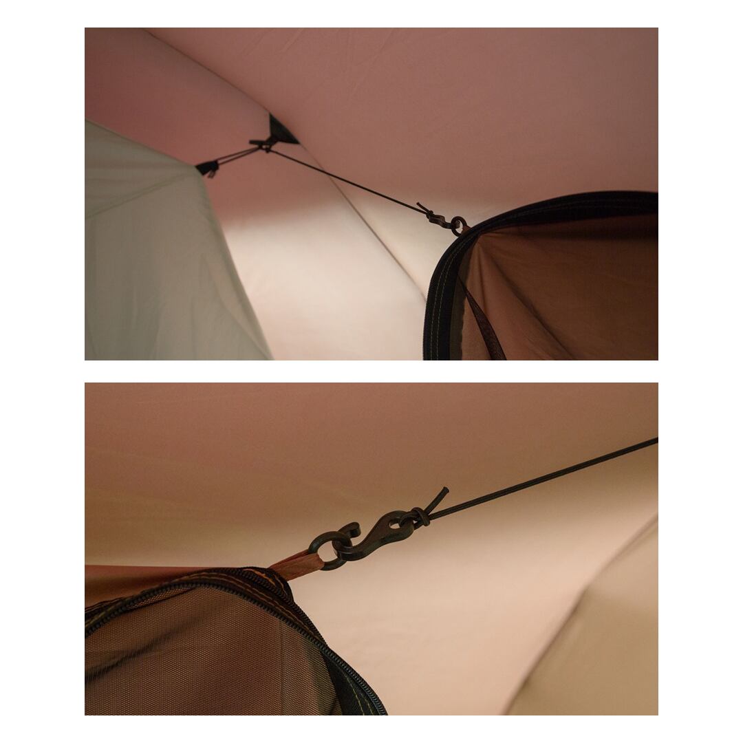 就寝用のインナールームは取り外しが可能で、外せば、大人数を収容できる大型シェルターに変身。グループキャンプなどで活躍します。インナールームは吊り下げ式なので、装着も簡単です。